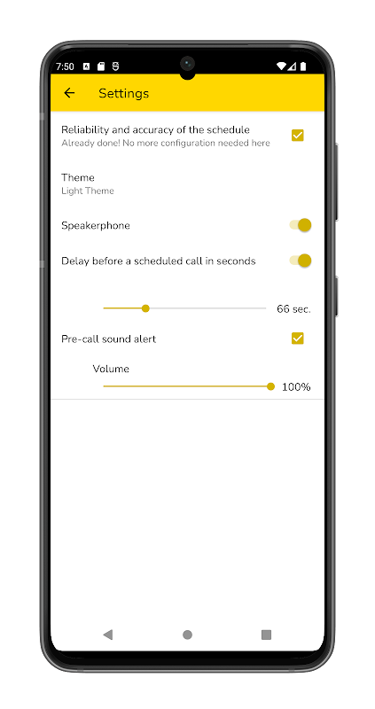 Dalam pengaturan aplikasi, Anda dapat mengatur penundaan sebelum panggilan, serta mengaktifkan peringatan sebelum panggilan dimulai. Dalam hal ini, program akan memberi sinyal, dan Anda dapat membatalkan panggilan jika berubah pikiran.