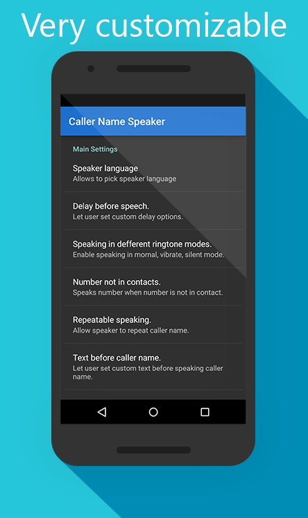 Nama Caller Speaker adalah aplikasi sederhana, yang berbicara keras-keras nama penelepon panggilan masuk. Aplikasi ini sangat membantu dalam situasi ketika tangan Anda sibuk, dan Anda tidak dapat menyentuh ponsel, terutama ketika Anda mengendarai mobil, atau telepon Anda di tempat lain. Speaker memungkinkan untuk mengidentifikasi siapa yang menelepon, dan berbicara dengan suara keras nama pemanggil menggunakan suara. Anda dapat menyesuaikan berbicara, misalnya Anda dapat memungkinkan speaker untuk berbicara frase sebelum dan sesudah caller ID, juga Anda dapat mengatur opsi kustom lebih banyak ketika pembicara sedang berbicara. Dengan aplikasi ini Anda dapat dengan mudah mengetahui siapa yang memanggil Anda tanpa melihat layar ponsel.