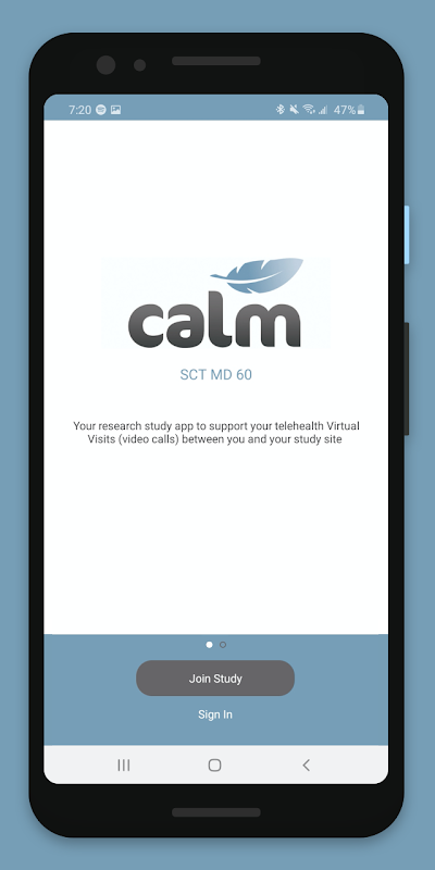 The calm study app is part of Syneos SCT-MD-60 research study. This app is used to provide the option of telehealth calls between the participant and the site’s principal investigators.