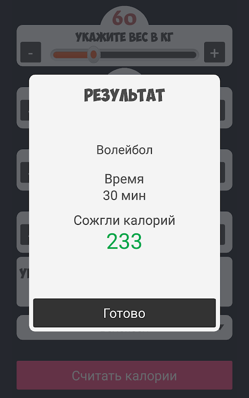 Tentukan parameter Anda, pilih olahraga, tentukan waktu bermain olahraga dan dapatkan hasil kalori yang terbakar untuk jangka waktu tertentu!