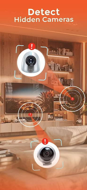 - Aplikasi ini akan membunyikan alarm dan menampilkan lingkaran merah di sekitar kamera tersembunyi yang terdeteksi.