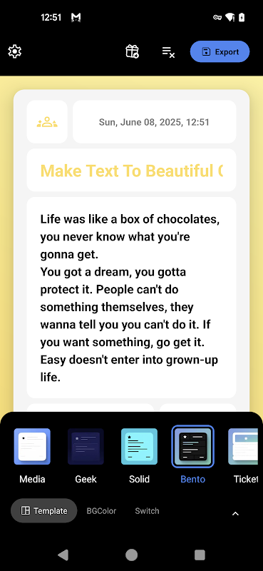Punya kata-kata? Ubah menjadi kartu yang menarik! Baik itu pesan yang menyentuh hati, ucapan selamat hari raya, atau kiriman media sosial, aplikasi kami langsung mengubah teks Anda menjadi desain yang indah dan dapat dibagikan. Tidak perlu keahlian desain!