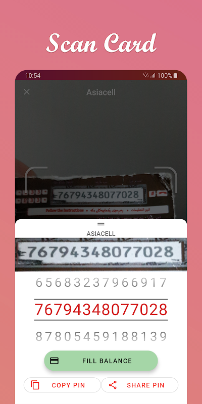 Aplikasi ini memfasilitasi proses pengisian saldo untuk kartu prabayar, membaca nomor kartu melalui kamera ponsel, dan kemudian memberikan hasilnya kepada pengguna kemudian dapat menggunakan nomor ini untuk mengisi saldo atau dengan mudah membagikan nomor kartu.