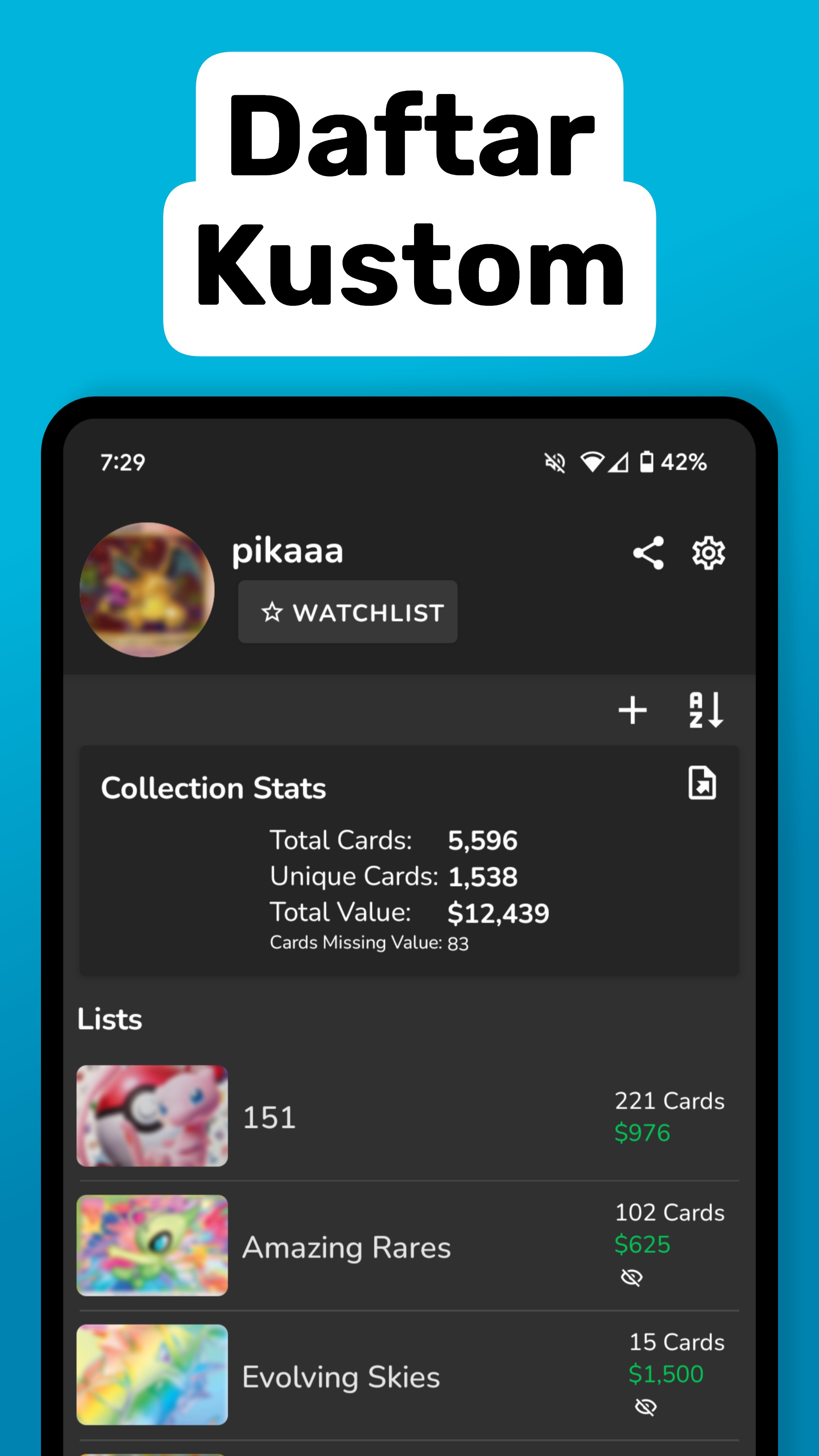 Buat daftar khusus untuk deck pertempuran, binder tukar, atau kartu incaran favorit Anda. Lacak seluruh koleksi kartu Pokémon Anda secara digital!