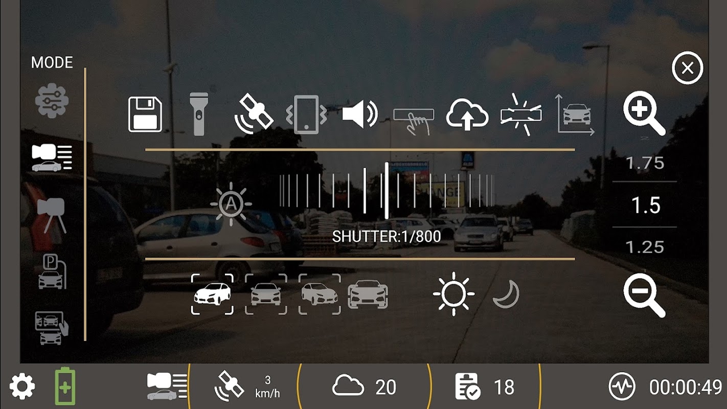 Aplikasi ini memungkinkan Anda menggunakan kamera ponsel untuk mengumpulkan data pengenalan pelat nomor (ANPR/LPR), bahkan dari kendaraan yang bergerak cepat. Peristiwa yang disimpan dalam database internal mencakup pelat nomor dan opsional, kelas, merek, model, warna, data GPS, dan stempel waktu.