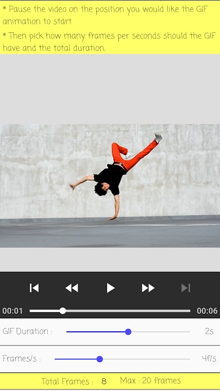 * Buat gif animasi - Pilih video dari galeri, pindahkan pegangan ke awal GIF dan tekan tombol "Hasilkan Bingkai".