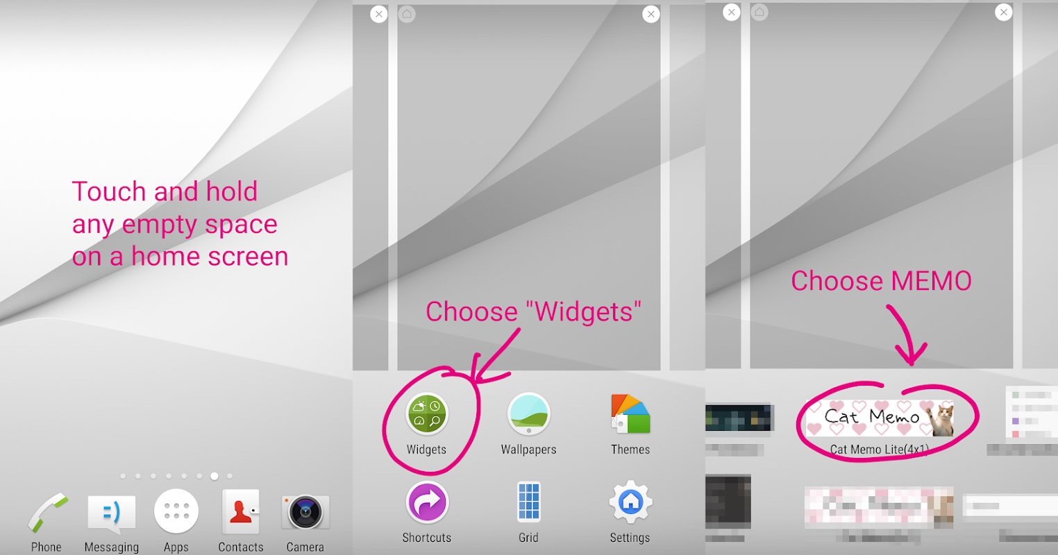 3. Sentuh dan tahan widget "Memo Kucing Gratis". Anda akan melihat gambar setiap layar Beranda.