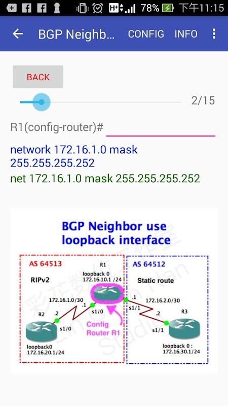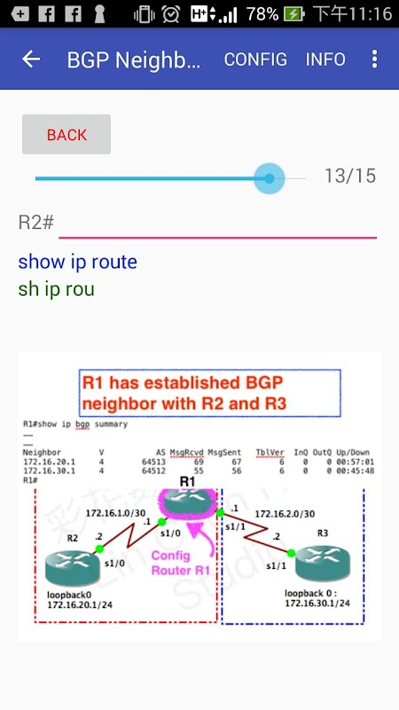 Versi premuim CCNA Routing Labs menyediakan 73 Lab perutean, termasuk protokol perutean pelajaran CCNA / CCNP: EIGRP / OSPF / RIP / BGP, dan layanan IP: DHCP / NAT / ACL / VRRP / HSRP / IP SLA / GLBP / PPP / NTP / Tacacs + / Radius / Telnet / SSH / L2, L3 EtherChannel untuk PAgP dan LACP, berikut adalah detail item LAB: