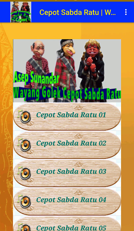 Nikmati koleksi terbaik Wayang Golek Sunda dalam lakon berjudul Cepot Sabda Ratu yang dibawakan oleh Ki Dalang Asep Sunandar. Install dan nikmati serunya petualangan Astrajingga (Cepot) yang diselipi menghiburnya bobodoran khas Sunda. Install dan nikmati cerita terbaik wayang golek yang penuh nuansa budaya Sunda serta kentalnya suasana alam tanah Pasundan.