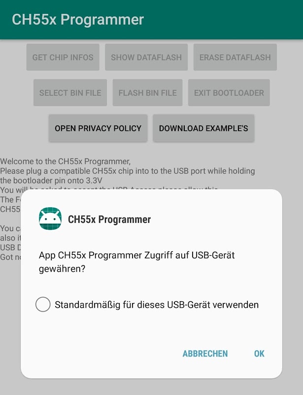 Please use this new version of the Programmer: https://play.google.com/store/apps/details?id=com.atcnetz.de.ch55xprogrammerV2