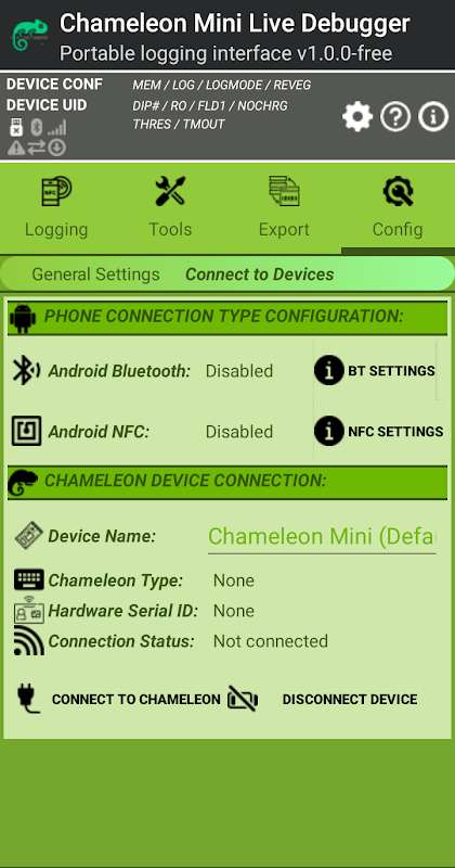 Bunglon Mini adalah alat perangkat keras untuk debugging NFC, emulasi kartu, pengujian keamanan, pengintaian, dan tujuan debugging umum atas interface ini. Perangkat NFC emulator kartu berukuran kecil dapat mengkloning kartu kontak-kurang dan tag RFID dan mengendus baku data RF berbingkai dikirim melalui antarmuka tanpa overhead tumpukan NFC penghalang Android. Versi terbaru dari papan Chameleon (Rev.> = g) memiliki pilihan untuk melakukan * LANGSUNG * logging dengan perangkat mana log mentah dicetak ke konsol secara real time. Aplikasi ini menyediakan antarmuka portabel untuk digunakan dengan fitur logging hidup perangkat untuk di mana saja dan siluman NFC card reader debugging dan pengujian.