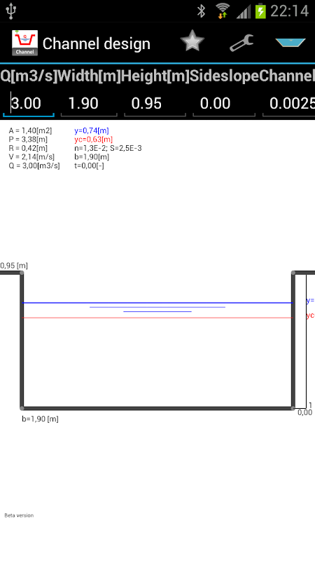 Memungkinkan Anda untuk secara interaktif merancang Terbuka Arus Saluran untuk persegi panjang, trapesium dan bentuk persegi panjang. Grafik saluran untuk skala dan output kedalaman air normal dan penting Anda.