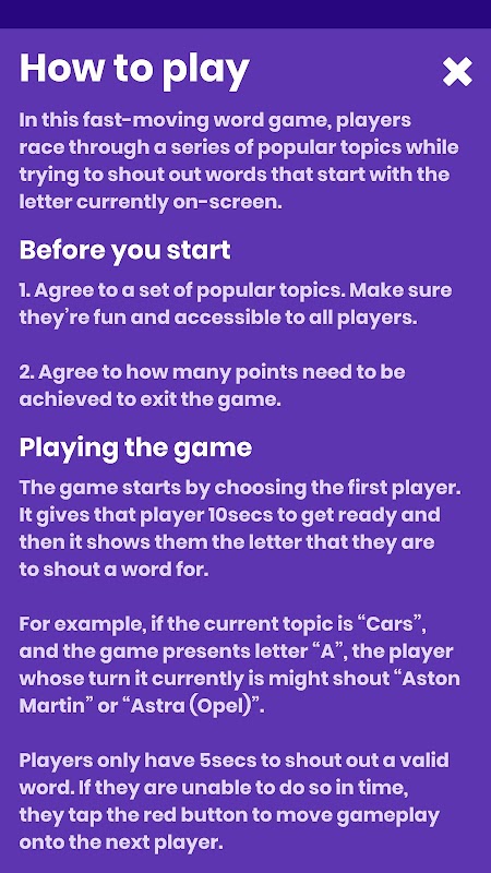 For example, if the current topic is “Countries”, and the game presents letter “G”, the player whose turn it currently is might shout “Ghana”.
