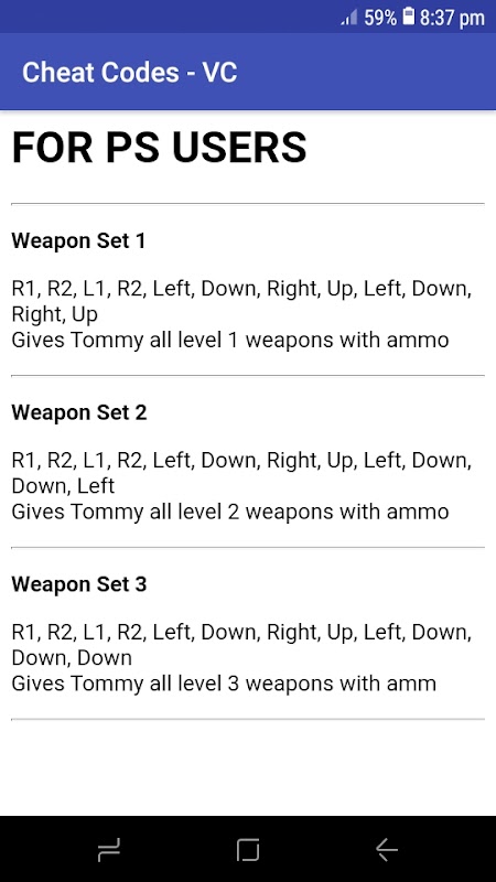 Kode cheat untuk VC dan VCS untuk platform yang berbeda