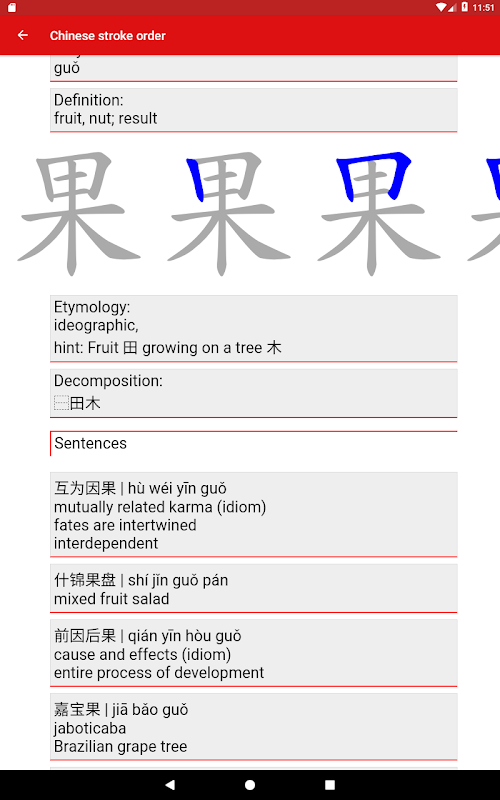 Semua karakter datang dengan animasi yang menunjukkan urutan pukulan. Setiap karakter juga dilengkapi dengan definisi, pengucapan pinyin, etimologi, dan banyak kalimat.