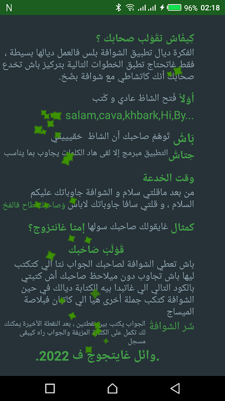 تقوم بفتح التطبيق و التوجه لإبدأ الشات مع الشوافة مريم ، لإضهار الأمر حقيقي قم بكتابة المفردات المغربية الشائعة على الشات ، فمثلا كتابة سلام ستجيبك الشوافة و عليكم السلام ، كتابة سافا ستجيبك لاباس , فالشوافة مبرمج للرد دون التدخل منك ، بعد دلك تبدأ ، قم بسؤال صديقك نينجا بأن يسأل هو الأخر سؤاله ، سيسأل نينجا مثلا من هي حبيبتي و فتاة أحلامي ؟ هنا سيبدأ دورك ستقوم مباشرة بكتابة رد سؤال نينجا بين نقطتين, أثناء هده العملية الشوافة سوف تقوم بمحاكات أثناء كتابة الجواب و ستضهر مقدمة للسؤال مبرمجة داخل التطبيق, لكن بمجرد علمها بوضعك النقطة الأخيرة للجواب ستدعك تكمل الكتابة التي تريدها ليضهر السؤال كاملا ، في حين أنها قامت فقط بتسجيل الرد لجواب سؤال نينجا و الذي سيضهر مباشرة بعد إرسال الرسالة. و إحرص أن يكون الجواب الدي أدخلته أولا بين نقطتين قصيرا و ملخصا .