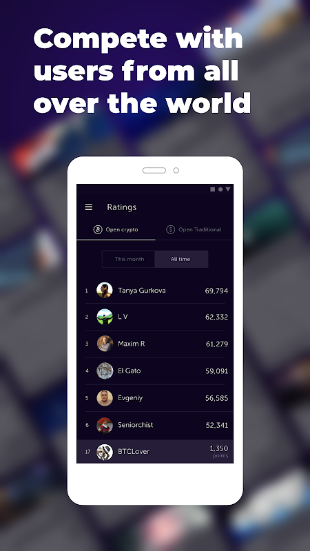 Untuk setiap perkiraan keuangan yang akurat, Anda menerima poin, naik peringkat dan memungkinkan Anda untuk memenangkan uang pada akhir bulan (dari $ 30 hingga $ 500). Peringkat tersebut mencerminkan kemampuan analitis Anda dan pemahaman Anda tentang keuangan, pasar saham, blockchain, dan cryptocurrency.