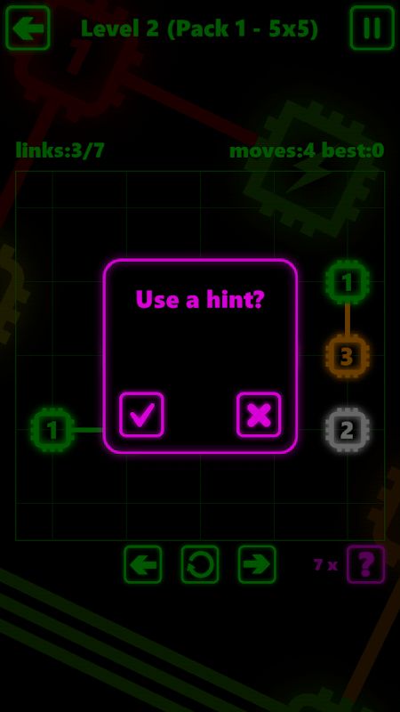 Find yourself really stuck? Use a hint to help complete the circuit. If you're looking for an additional challenge however, try to complete each level perfectly by making no mistakes.