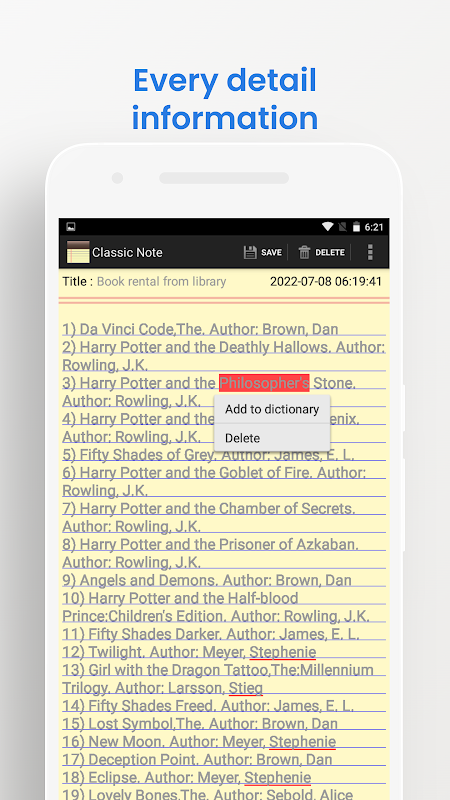 Classic Notes is a simple and easy to use note app. Using this app you can take notes, save shopping list, memo and todo list, or whatever you want to write and save for later read. You can also retrieve the notes you saved by search function.