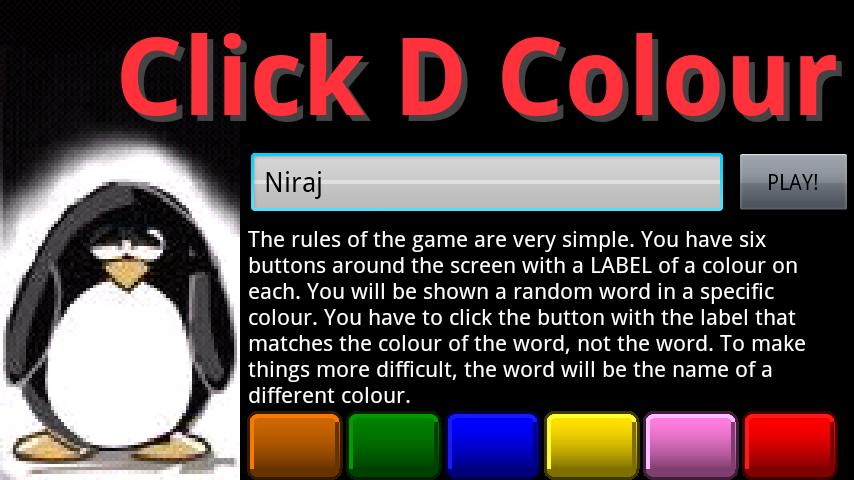 The idea of the game is to click on the button, with the label, that is the actual colour the word is painted in. Simple you would think, but it is not.