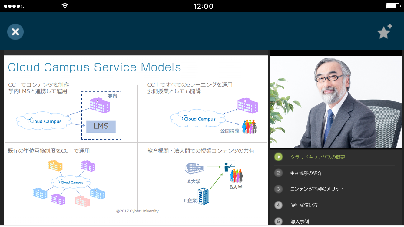 "Cloud Campus" disediakan sebagai SaaS (Service sebagai Software a). "CloudCampus" memungkinkan Anda untuk membuat konten kursus online dalam bentuk tampilan layar ganda video dan slide, memberikan kepada Pelajar Portal" dengan streaming, dan menyimpan catatan peserta didik melihat.