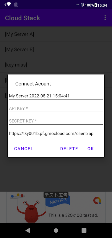 1.Tambahkan Connect Acount di menu. Memerlukan "KUNCI API", "KUNCI RAHASIA", "TITIK MASUK".