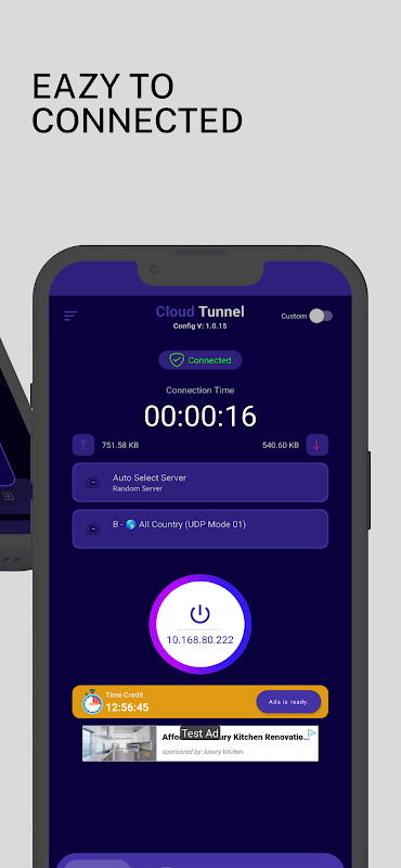 Menavigasi melalui Cloud Tunnel sangatlah mudah. Antarmuka kami yang ramah pengguna memungkinkan Anda terhubung ke VPN hanya dengan satu ketukan, memberikan pengalaman tanpa kerumitan bagi pengguna pemula dan berpengalaman.