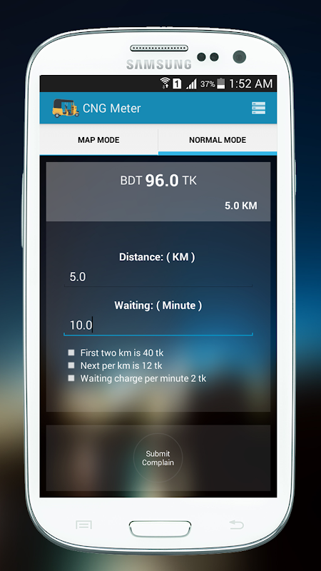 GPS berbasis CNG tarif kalkulator dengan mengeluh pilihan.