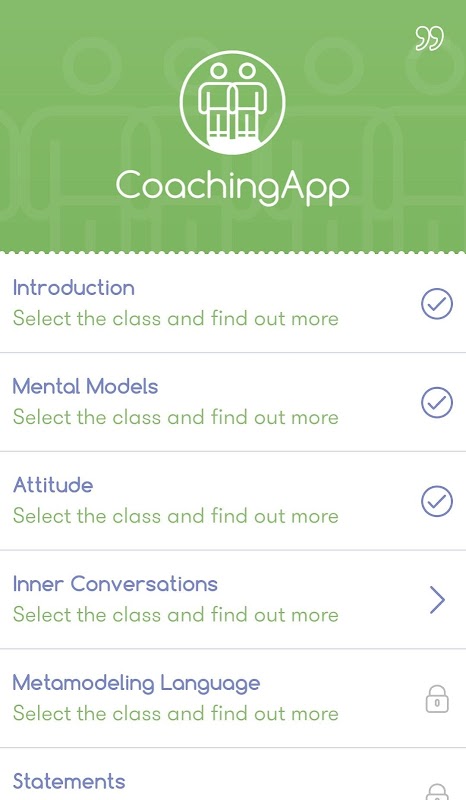 Dalam APP ini Anda dapat menemukan pelajaran Coaching Pribadi berorientasi pada transformasi pribadi dan pencapaian tujuan.