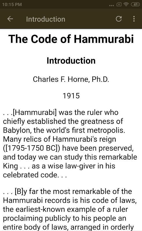 Aplikasi ini menampilkan Kode Hammurabi yang diterjemahkan oleh L. W. King.