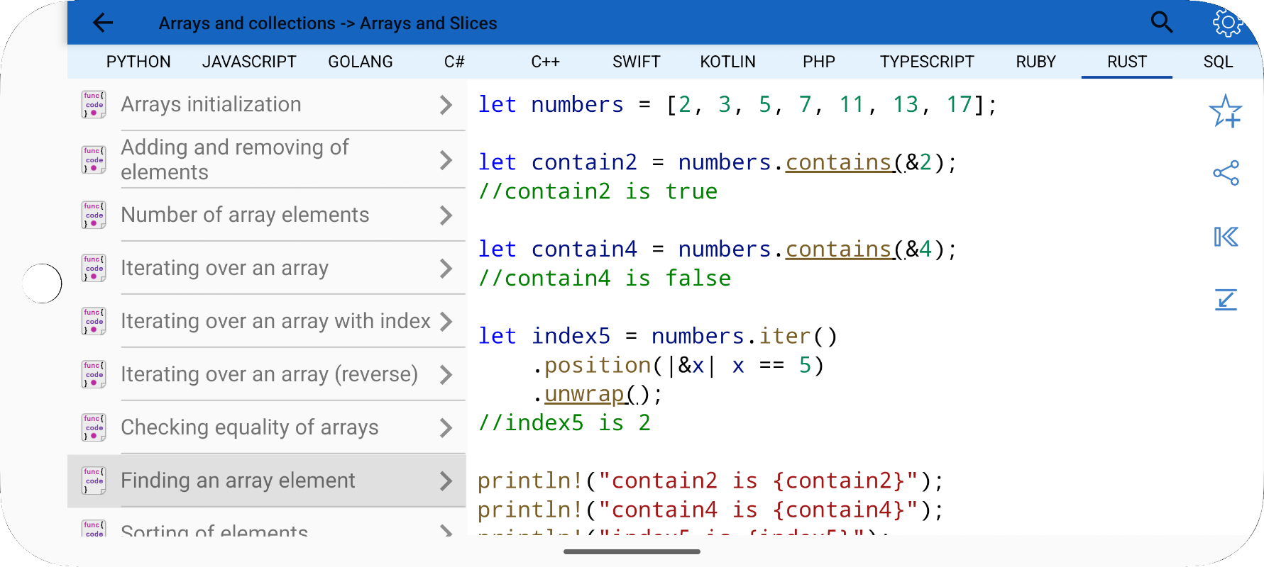• Aplikasi ini merupakan alat yang baik selama ujian atau persiapan wawancara karena berisi referensi tentang operasi yang sering digunakan dalam berbagai bahasa pemrograman.
