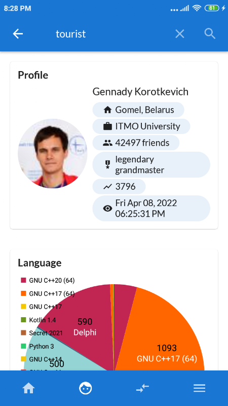 Periksa kontes Codeforces yang akan datang. Lihat profil pengguna Codeforces dan bandingkan