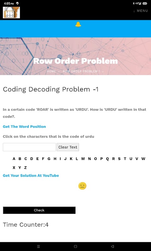Tiga kata diberikan dalam setiap masalah pengkodean decoding dari setiap dua kata adalah kata asli dan kata terenkripsi atau kode.. Anda harus menemukan aturan yang benar yang digunakan untuk mengenkripsi atau mengkode kata dan kemudian menyandikan kata ketiga yang diberikan menggunakan aturan yang sama . Cukup ketik kata menggunakan huruf yang diberikan dan kemudian klik tombol centang untuk melihat apakah Anda benar atau salah.