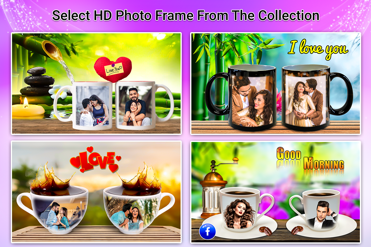 Cup kopi atau mug bingkai ganda membantu Anda untuk mengedit foto Anda dari foto cinta Anda melalui bingkai foto cangkir kopi yang berbeda.