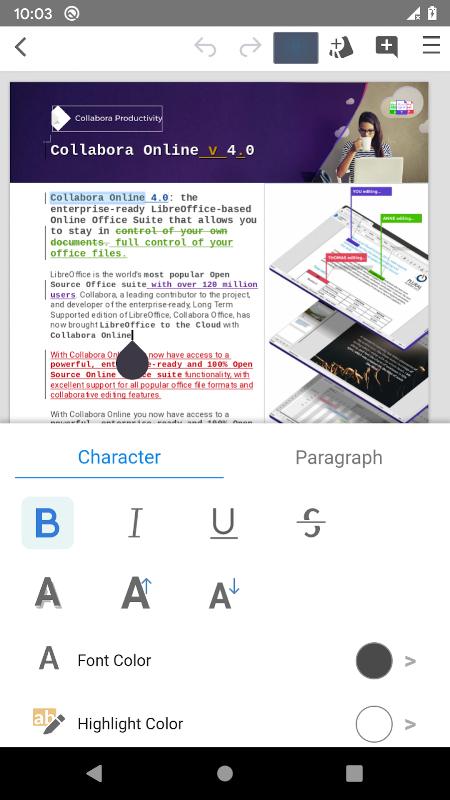 Collabora Office adalah program penyunting teks, lembar kerja, dan presentasi berbasis LibreOffice, perangkat lunak perkantoran sumber terbuka terpopuler di dunia - dan kini tersedia di Android, meningkatkan kemungkinan Anda untuk bekerja di perangkat seluler dan berkolaborasi.