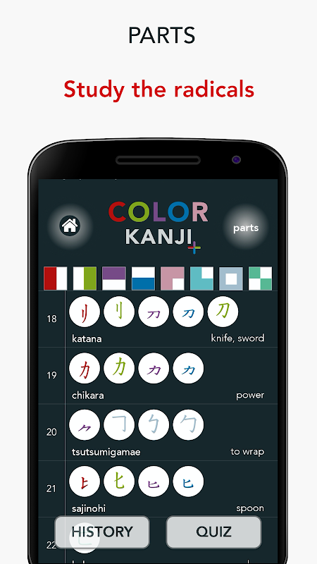 Warna Kanji Plus dibuat berdasarkan ide yang berbeda: Pelajari semua bagian untuk kanji terlebih dahulu. Ketika Anda dapat memecah karakter menjadi bagian-bagiannya, bahkan kanji dengan banyak goresan menjadi mudah dikenali. Plus itu memungkinkan Anda untuk mengambil keuntungan dari bagian phono-semantik yang memberikan petunjuk pada apa arti karakter, dan apa yang terdengar.