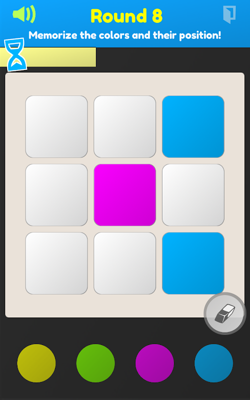 In this grid of squares you will need to memorize the colored squares and their position in the grid before the time runs out, where the grid will switch back to blank tiles. If you guess correctly, you will move on to the next round. If you fail your guess, the game is over.