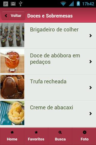 Nesta primeira versão, você poderá ter acesso a 250 receitas, divididas em 25 categorias diferentes (por exemplo: Arroz, Aves, Bebidas etc), todas elas com imagens e sempre acessíveis, já que não requer conexão com a internet (exceto para enviar fotos).