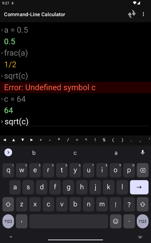 Dengan menyediakan antarmuka baris perintah, CLCalculator memungkinkan Anda untuk dengan mudah masuk dan melihat riwayat perhitungan Anda. Anda fokus pada perhitungan Anda alih-alih diintimidasi oleh banyak sekali tombol pada antarmuka kalkulator tradisional! Selain melakukan perhitungan dasar, CLCalculator menyediakan berbagai fitur seperti: