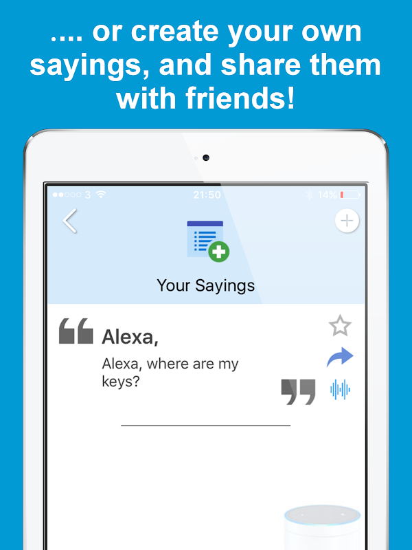 Use our Commands for Alexa Echo App to create your own sayings for your Amazon Alexa device, and then share them with your friends!