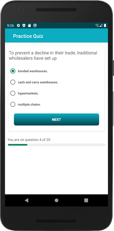 Setelah siswa membaca catatan, mereka dapat melanjutkan untuk melanjutkan ke soal-soal ujian praktik pilihan ganda. Pertanyaan diacak setiap kali dan setelah setiap kuis, skor ditampilkan. Siswa kemudian dapat memeriksa pertanyaan, melihat apa yang salah dan juga menunjukkan jawaban yang benar untuk setiap pertanyaan.