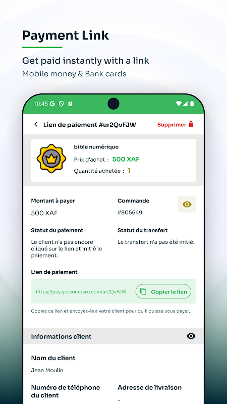 - Lacak semua pesanan dan klien, bahkan dengan pembayaran tunai saat pengantaran. Pembayaran langsung masuk ke Mobile Money Anda.
