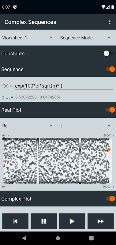 Plot nyata dan kompleks memberikan umpan balik visual saat Anda melangkah melalui urutan. Plot sebenarnya dapat menampilkan Re (z), Im (z), Mod (z), Arg (z), Re (jumlah), Im (jumlah), Mod (jumlah), atau Arg (jumlah). Plot kompleks dapat menampilkan nilai urutan atau jumlah parsial. Anda dapat mengubah mode plot di titik mana pun secara berurutan, memungkinkan Anda melihat dengan jelas bagaimana nilai berubah seiring waktu. Plot menjadikan aplikasi ini alat yang sangat berharga untuk memahami perilaku jangka panjang dari rangkaian dan rangkaian.
