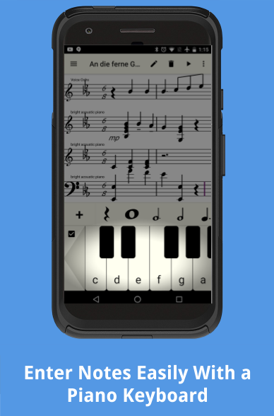 Menulis musik hanya menggunakan keyboard piano untuk masuk catatan. Gunakan aplikasi ini untuk menulis dan mengedit lembaran musik. Terbuka musik XML file dari situs populer seperti MuseScore dan mengeditnya.