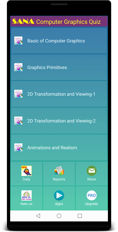 Aplikasi kuis grafis komputer adalah konsep inovatif dari Sana Edutech yang menyediakan materi pembelajaran pada aplikasi Android dalam antarmuka pengguna yang cepat dan menyenangkan.