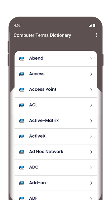 setiap kata dan istilah mengandung makna dengan deskripsi singkat mereka dari setiap kata. kamus komputer juga memiliki pilihan mencari untuk menemukan sesuai dengan pilihan Anda.