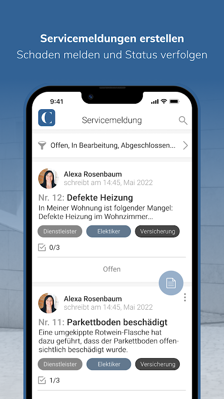 Sebagai pelanggan CONFORMA Immobilien Management GmbH, Anda mendapatkan keuntungan dari layanan pelanggan inovatif yang menawarkan banyak kebebasan. Dengan aplikasi CONFORMA Anda dapat melaporkan kekhawatiran dan kerusakan kepada kami sepanjang waktu menggunakan ponsel cerdas Anda, termasuk dokumentasi foto. Kami juga menyediakan folder dokumen digital berisi dokumen penting untuk properti Anda. Kami menggunakan papan buletin digital untuk secara proaktif memberikan informasi tentang informasi penting tentang properti yang dipercayakan kepada kami melalui pesan push.