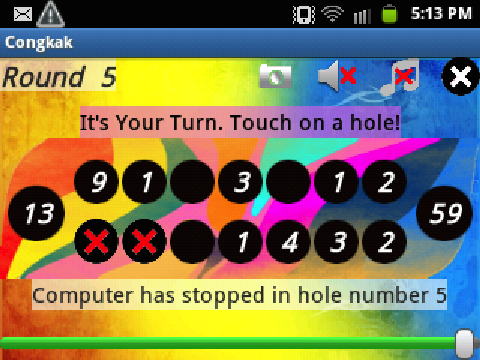 The Congkak board has seven holes in each player side, plus an additional bigger store-hole for each player. In the beginning, each holes has seven seeds, except the bigger holes are empty. Each player controls holes on their side, and their score is the number of seeds in their store.