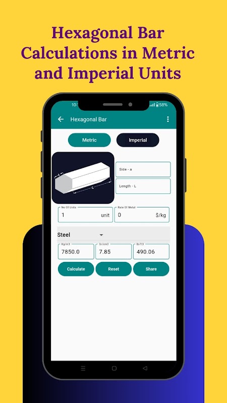 Kalkulator berat logam dapat menghitung dengan Sistem Pengukuran Imperial & sistem Pengukuran Metrik. Kalkulator Logam adalah aplikasi gratis untuk penghitungan kuantitas logam. Kami menggunakan alat sederhana dalam aplikasi untuk menyederhanakan perhitungan. Kami membantu menghitung hampir semua jenis berat logam. Aplikasi dibagi menjadi beberapa bagian berdasarkan bentuk dan jenis logam. Baik Anda perlu menghitung jumlah, bentuk, sambungan, atau melakukan berbagai pengujian, aplikasi kami memastikan hasil yang akurat setiap saat. Dirancang untuk pembangun, kontraktor, dan insinyur mesin, alat ini memberikan pengukuran yang andal dan akurat yang dapat Anda percayai.