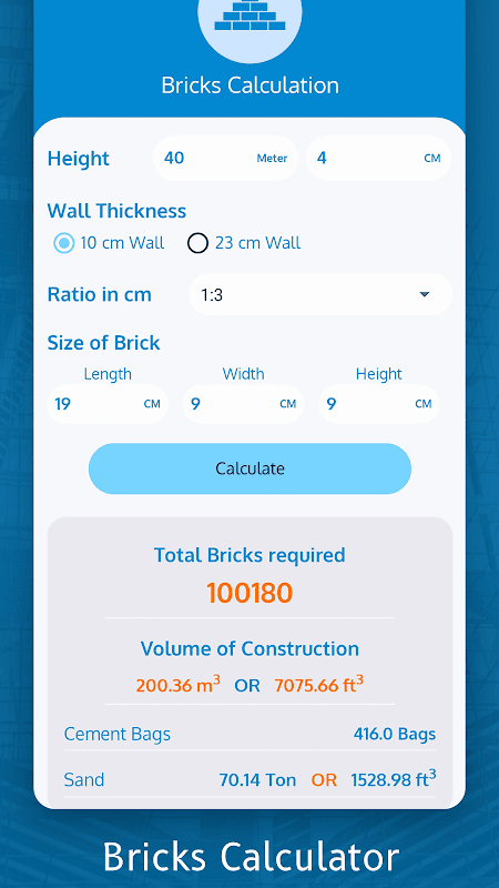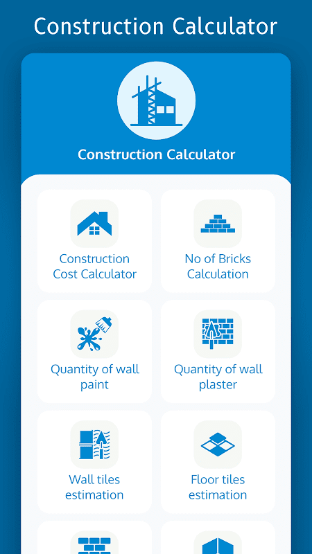 Kalkulator konstruksi akan menghemat waktu Anda yang berharga, hanya dengan beberapa ketukan di ponsel cerdas Anda, Anda dapat menghitung semua bahan konstruksi dan jumlahnya dalam beberapa detik. Sekarang, Anda tidak perlu khawatir lebih jauh tentang akurasi, kalkulator pembingkaian bebas dari kesalahan dan semua rumus serta algoritme telah diuji dengan baik untuk memastikan penghitungan yang akurat.
